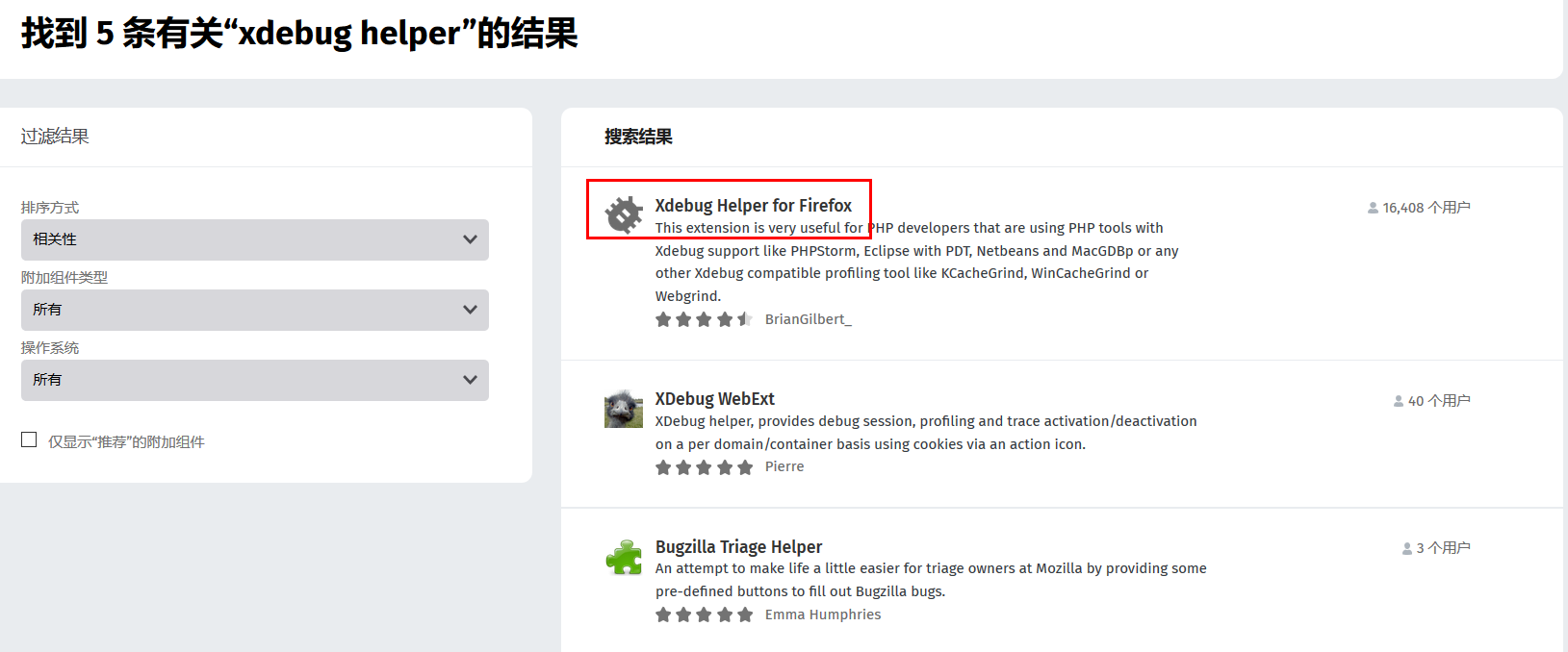 输入 xdebug helper 然后按Enter回车健, 出现结果的第一条就是我们要安装的拓展: