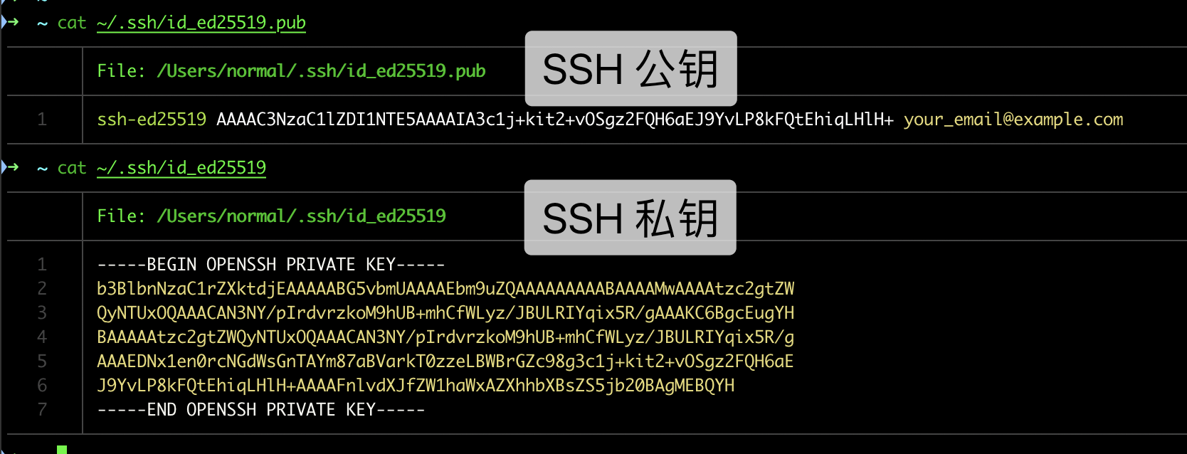 按照提示完成三次回车,即可生成 ssh key。通过查看 ~/.ssh/id_ed25519.pub 文件内容,获取到你的 public key